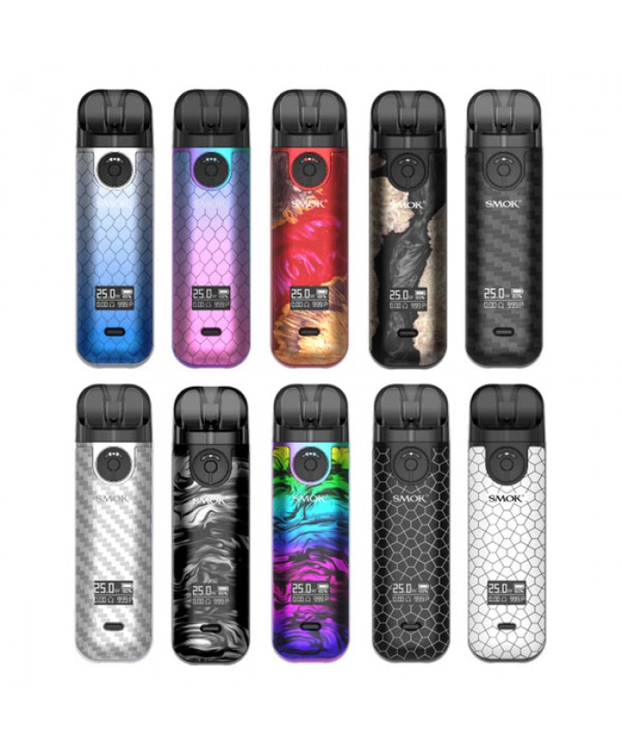 SMOK Novo 4 is a fusion of the excellent features of Novo X and Nord 4. It retains the screen, battery, and performance of Novo X, inherits the exquisiteness and ease of use of the Novo series; and makes Nord 4's air-inlet ring airflow control system and type-c port continue to be used on this device, compatible with the innovative leak-proof coil design LP1 series coils, it becomes a pod system with all-round fresh functions. The emergence of Novo 4 has made a sharp impact on the traditional pod system, with its performance & flavor, stylish appearance, and compact style. Novo 4 is made of durable textured zinc alloy, available in ten stylish color options, sturdy and durable. It adopts a one-button design to achieve a simple style. The button is not only a power on/off button but also a wattage adjustment button. This pod system is equipped with an integrated, rechargeable, long-lasting 800mAh battery, so you can enjoy hours of vaping with minimal charging. Upgraded type-c port helps optimize charging efficiency. Above the button is a 0.49-inch OLED screen. Use the single-mode button below the screen to adjust the wattage anywhere between 5 and 25W. The Novo 4 comes with one replaceable coil, refillable pod cartridge for a customizable vaping experience. The cartridge can hold up to 2ml of e-liquid, and can be easily filled through the side filling port: just remove the cartridge from the device, lift the rubber plug on the side of the pod, and insert your favorite e-liquid to start filling. In addition, a silicone ring is added to the bottom of the Novo 4 Pod, which can effectively prevent liquid leaking from the pod, which can lead to a messy e-cigarette experience or dirty hands. Nord 4 includes two LP1 Meshed 0.8ohm coils optimized for leakage prevention. LP1 series coils is a new product line specially designed for leak-proof vaping. Each coil in this series uses 3 silicone rings to provide tightness. On the front of the device, you'll find an air-inlet ring dial that lets you fine-tune the airflow to achieve the perfect throat hit. Rotate the air intake ring and roll the air vents of different sizes to find the value that best meets your requirements for vapor flavor and thickness.