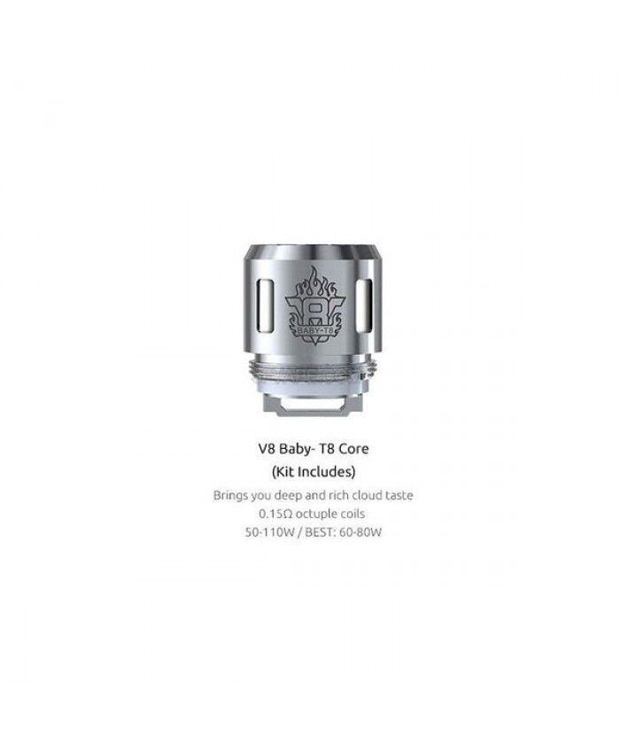 The SMOK V8 Baby-T8 0.15ohm Coil Head is introduced with the SMOK TFV8 Baby Beast Tank, built for huge clouds and flavour. It features a quadbarrel, is a coil setup and is designed to enhance flavor while still allowing higher power vaping, the V8 Baby T8 is best used between 60 and 80 Watts. 5 pcs a pack.